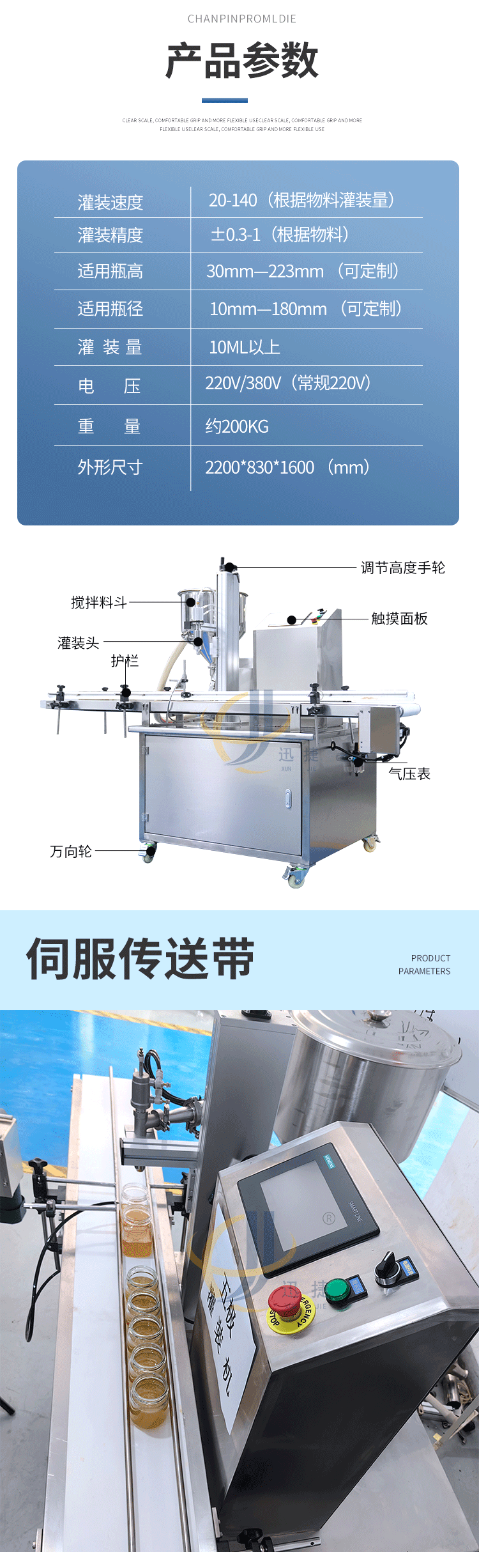 五極灌裝機:極快-單頭2200瓶/時 極簡-操作簡單 極廣-啥啥都能灌 極穩(wěn)-24小時不停機 極準-200g誤差小于1g。它可以和真空旋蓋機搭配使用。